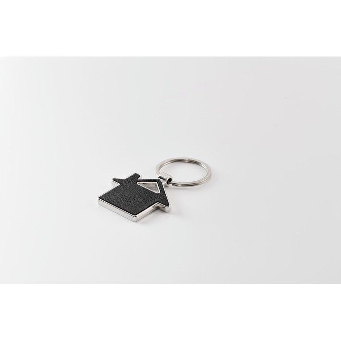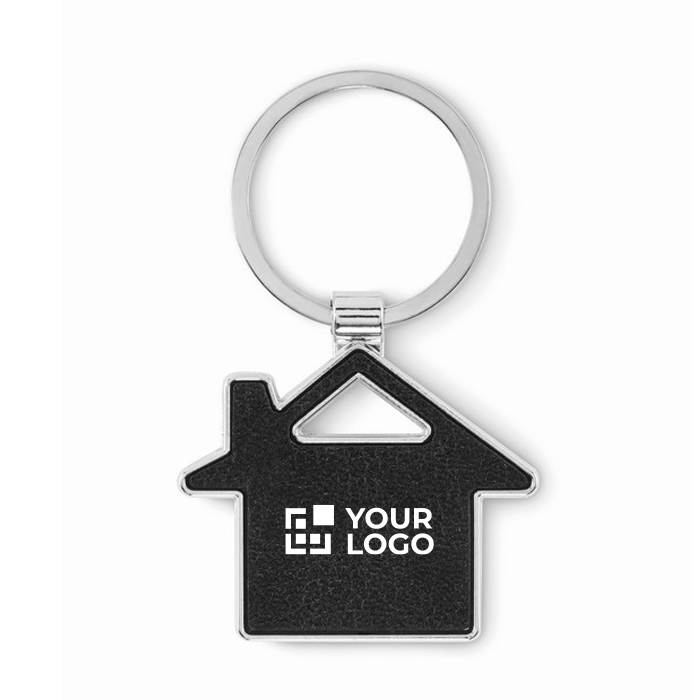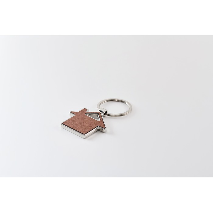 Llavero metálico de forma de casa con incrustación de cuero sintético