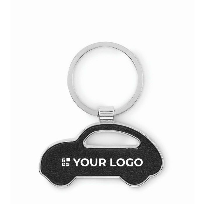 Llavero metálico de forma de coche con incrustación de cuero sintético