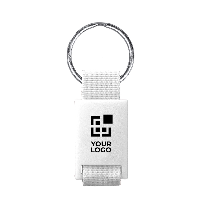 Llavero con cinta de poliéster y anilla metálica, pensado para que tu logo viaje a diario. Ligero, resistente y fácil de localizar en bolso o mochila.