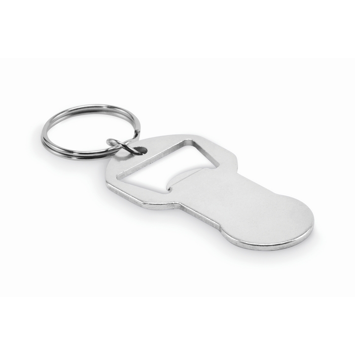 Llavero abrebotellas de aluminio reciclado con anilla de hierro y ficha para carro de la compra. Formato compacto para llevar en el llavero y tenerlo a mano en eventos, oficina o desplazamientos. La anilla metálica asegura un enganche firme a llaves, mochilas o identificadores. La ficha integrada permite usar carros de supermercado sin necesidad de monedas, lo que facilita el día a día. Adecuado para personalización y entrega en packs de bienvenida, ferias o campañas de promoción interna.