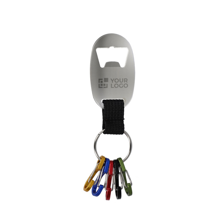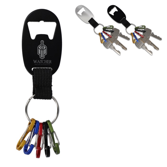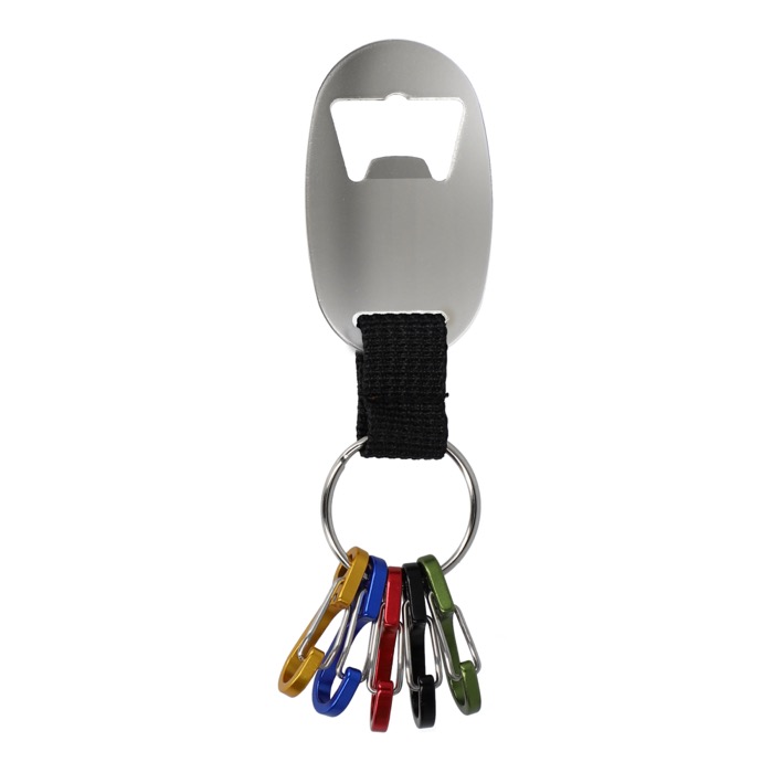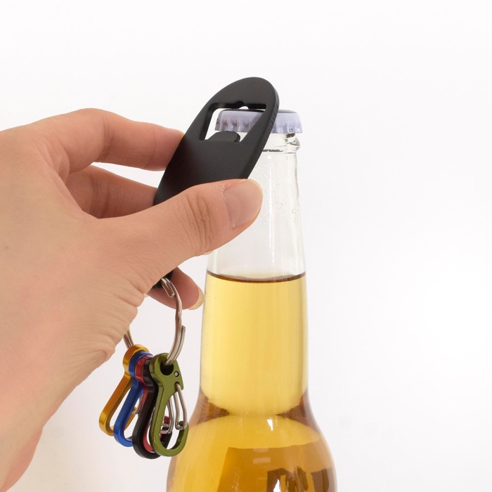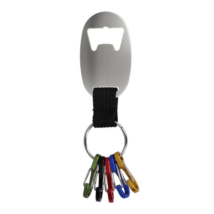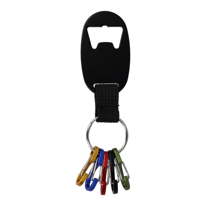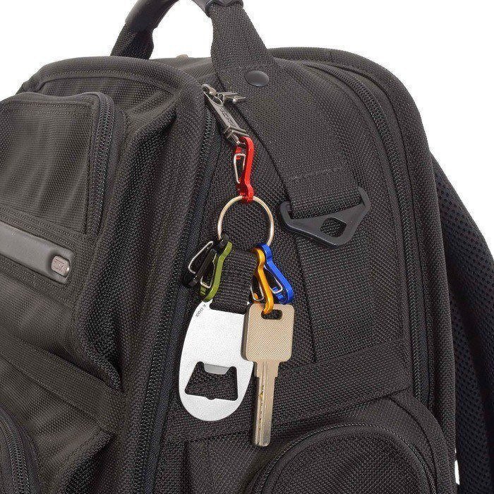 Llavero abrebotellas de aluminio reciclado con ganchos mosquetón para máxima organización
