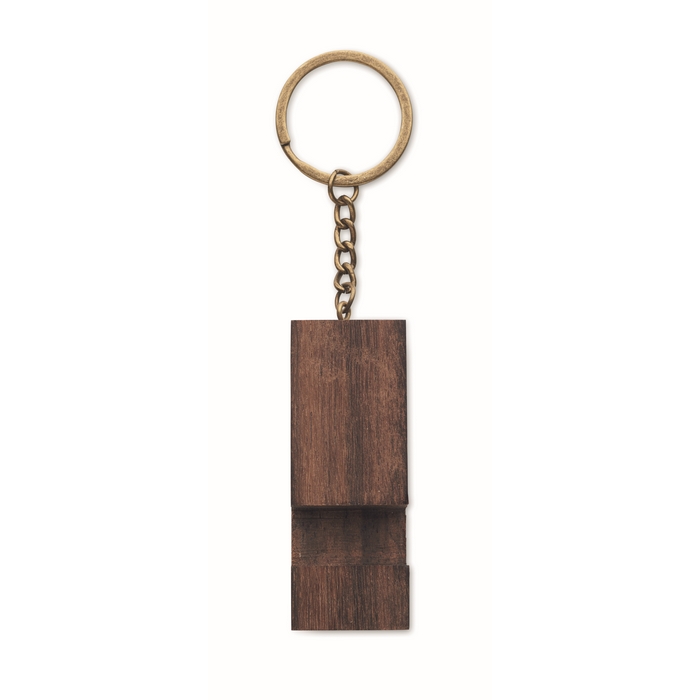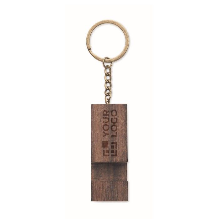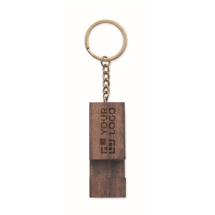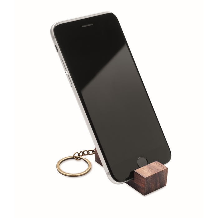 Llavero con logo de madera de nogal con función de soporte para móvil