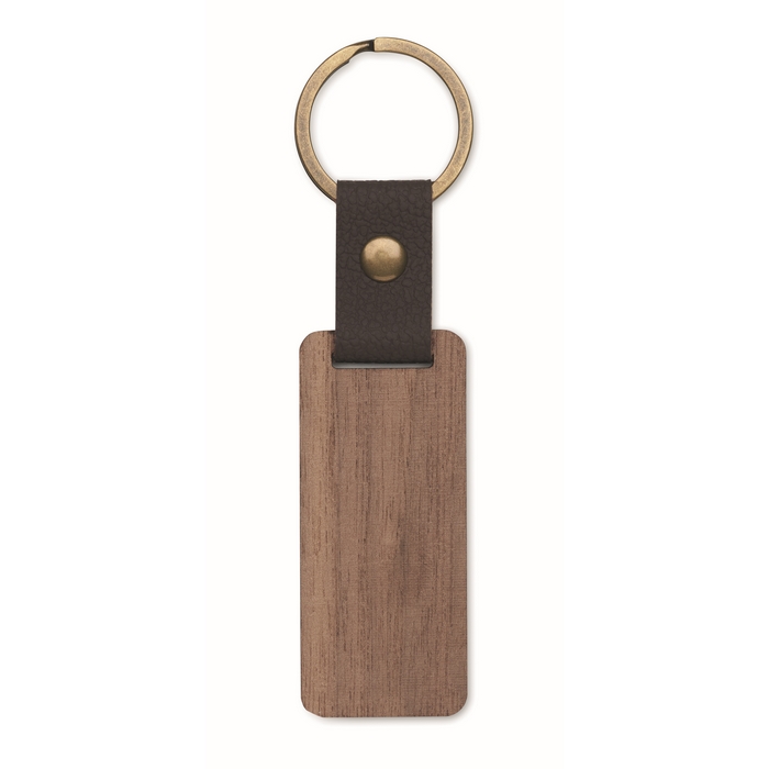 Llavero rectangular de madera con detalle de cuero sintético