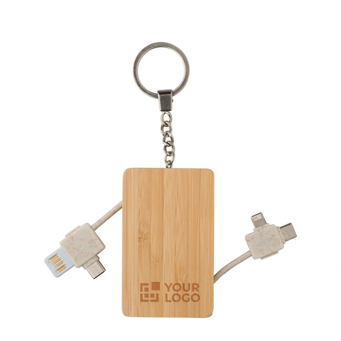 Llavero promocional de bambú con diferentes cables de carga escondidos