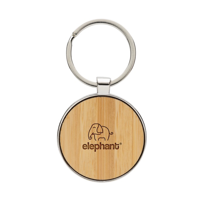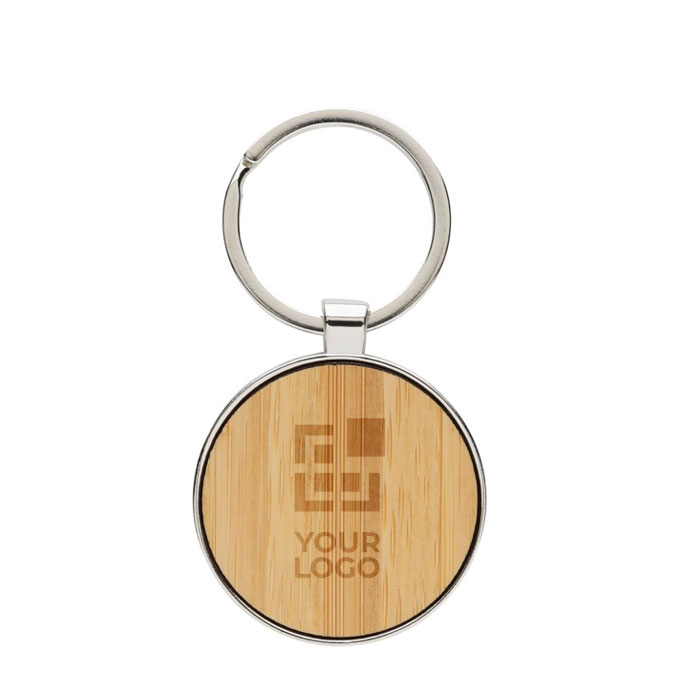 Llavero con forma redonda de bambú y aleación de zinc reciclado