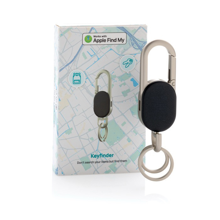 Llavero Keyfinder fabricado con materiales de alta calidad, diseñado para mantener tus llaves siempre localizables. Incorpora la tecnología Find My, que se integra perfectamente con la aplicación de Apple, permitiendo recibir notificaciones instantáneas si las olvidas. En caso de pérdida, su rastreo global a través de la red Find My facilita su recuperación. Al acercarte, activa un sonido para localizarlo con precisión. Equipado con una batería recargable de larga duración, se carga fácilmente mediante USB-C, eliminando la necesidad de reemplazos. Presentado en una elegante caja de regalo con certificación FSC (Forest Stewardship Council), es ideal para empresas que buscan soluciones prácticas para la gestión de objetos personales. Perfecto para incluir en kits de bienvenida corporativos o como obsequio en eventos empresariales.