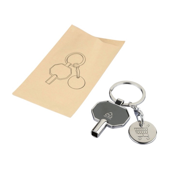 Llavero de aleación de zinc reciclado con purgador de radiadores y moneda para la compra, pensado para un uso diario en entornos profesionales. Incorpora llave cuadrada de 5x5mm, una medida habitual en Europa para el mantenimiento de radiadores, y una anilla metálica resistente para llevarlo con llaves o tarjetas de acceso. Incluye logotipo de reciclado y se entrega en funda de papel individual, dentro de sobre de cartón marrón con ilustración. Adecuado para campañas de mantenimiento, ferias técnicas o acciones de marca en instalaciones.