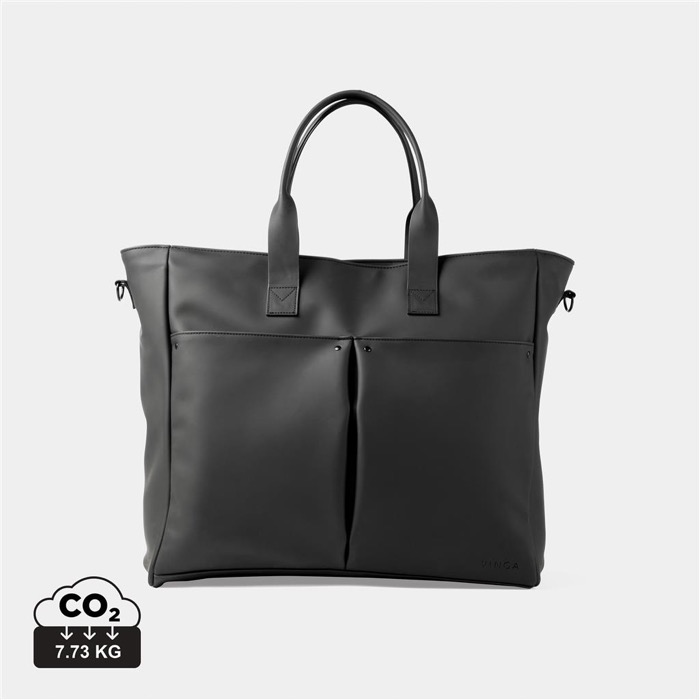 Bolso Vinga confeccionado en tejido PU nobuk, ligero y repelente al agua, ideal para la vida de oficina moderna. Su elegante exterior mate y el interior de tejido sintético ligero ofrecen un diseño sofisticado y funcional. Con una capacidad de 30,000 ml, este bolso está especialmente diseñado para guardar todos los elementos esenciales de la oficina, permitiendo una transición fluida entre trabajar en casa y en otros lugares. Incluye un compartimento acolchado para un portátil de hasta 15 pulgadas, asegurando su transporte seguro y cómodo. Además, cuenta con varios bolsillos exteriores para cables, adaptadores y otros accesorios, y una correa de hombro ajustable para mayor comodidad. Suministrado en bolsa y a granel, es perfecto para empresas que buscan soluciones prácticas para sus empleados, facilitando el transporte de equipos y documentos entre diferentes entornos de trabajo.