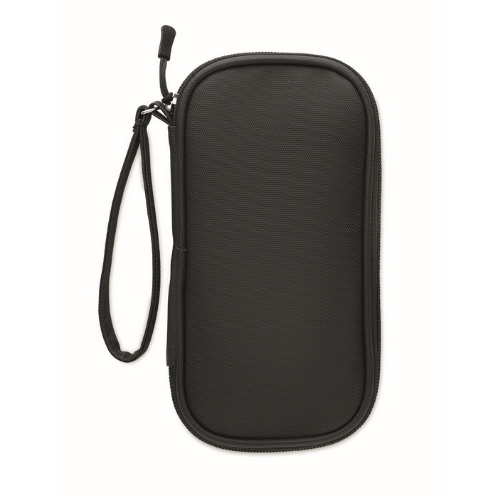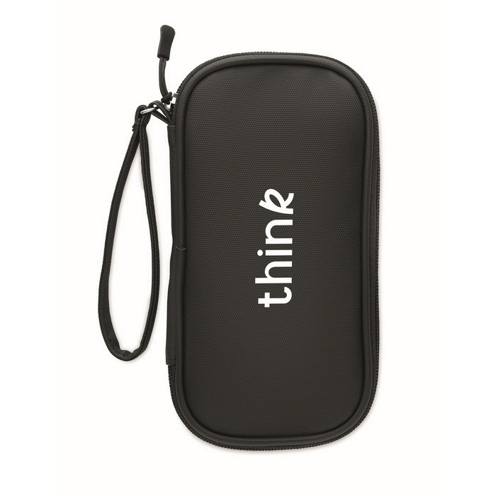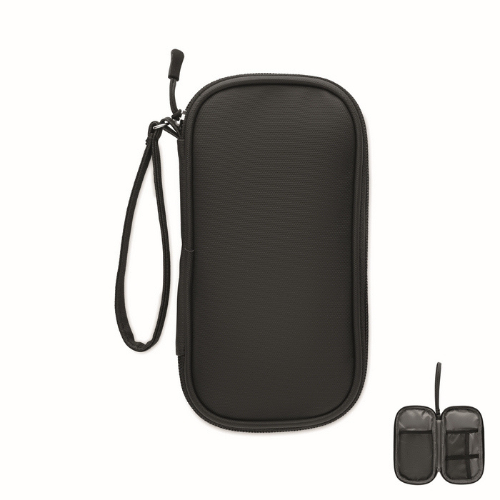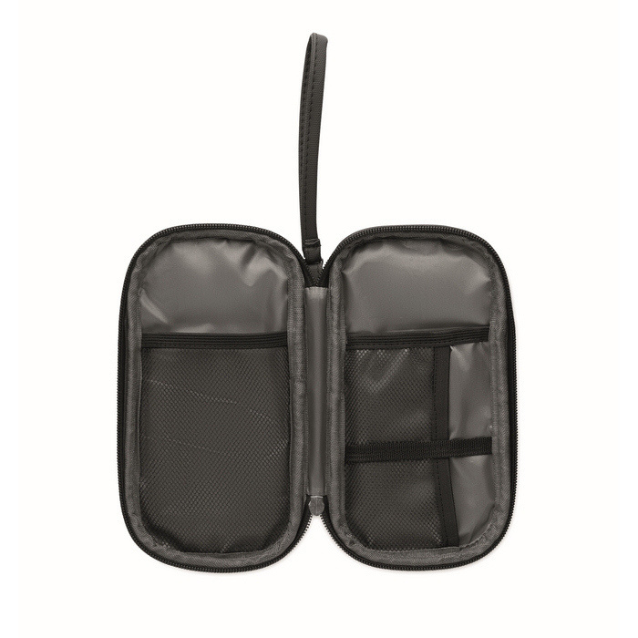 Bolsa organizadora técnica de poliéster RPET 600D con revestimiento de PU, pensada para ordenar accesorios y material de trabajo. El tejido resistente ayuda a soportar el uso diario y el acabado exterior facilita la limpieza. Formato compacto para llevar en mochila, maletín o en el coche sin ocupar espacio. Adecuada para guardar cables, adaptadores, herramientas pequeñas o documentación. Buena opción para packs de bienvenida, kits de formación o acciones de merchandising interno.