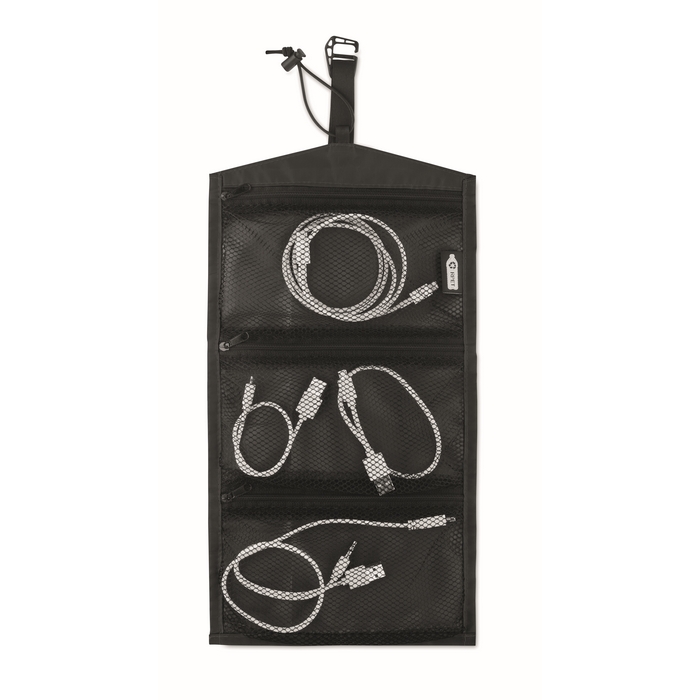 - Bolsa organizadora de cables en RPET 210D con malla y compartimentos