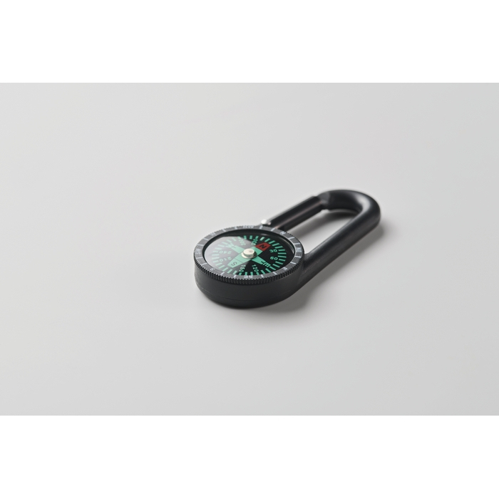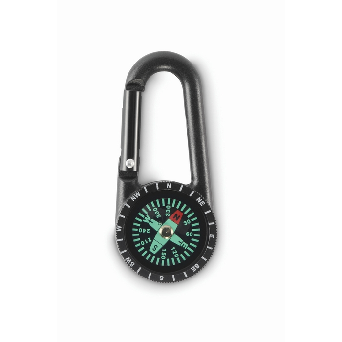 Brújula ligera con mosquetón, ideal para fijar a mochilas y tener siempre a mano en tus aventuras. Compacta y práctica, perfecta para regalos corporativos.