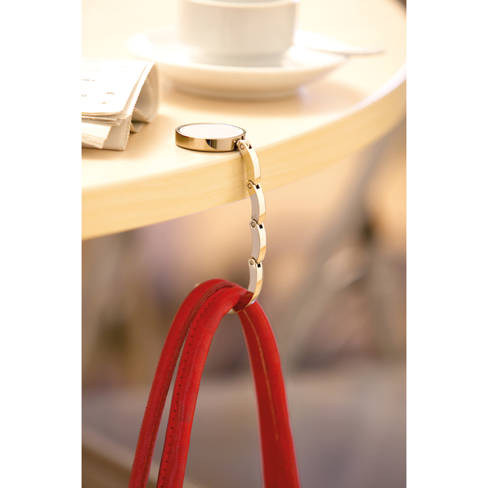 Este cuelgabolsos es práctico y elegante. Tiene un gancho plegable segmentado que se ajusta bien a mesas de distintos grosores. Así puedes colgar tu bolso sin que toque el suelo, manteniéndolo limpio y seguro. Es compacto, cabe en cualquier cartera. No viene con embalaje individual. Es uno de nuestros productos más vendidos, elegido por muchos clientes por lo útil que es. Además, puedes personalizarlo con gota de resina, para un mejor impacto. ¿Lo necesitas pronto? Está disponible con servicio Express.