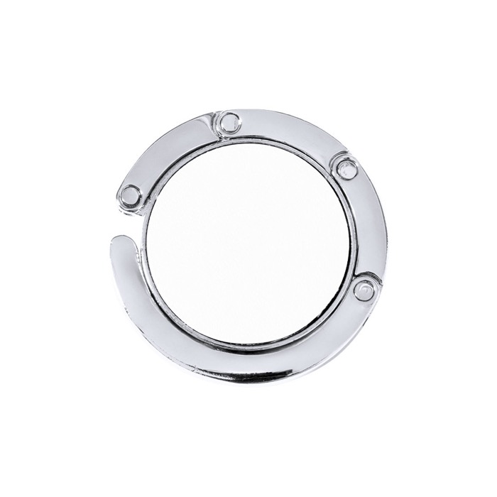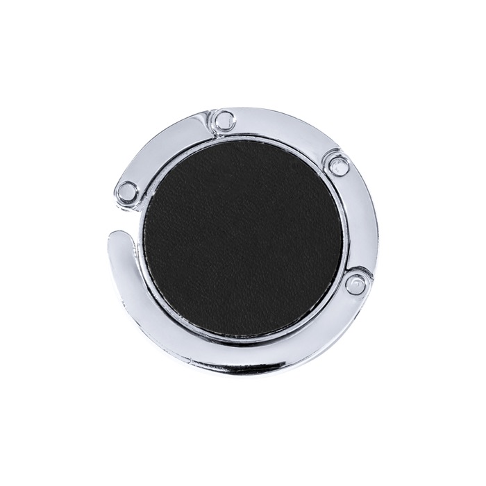 Cuelgabolsos metálico plegable con corona en polipiel de vivos colores. Este práctico accesorio es ideal para mantener los bolsos seguros y al alcance de la mano. Con un tamaño compacto de 3.3Ø x 8 cm, se presenta en un elegante estuche individual con interior troquelado, lo que facilita su almacenamiento y transporte. La superficie superior permite la personalización con el logo de la empresa, ya sea a color o grabado a láser, convirtiéndolo en un regalo corporativo atractivo. Suministrado en una bolsa y caja negra individual, es perfecto para eventos empresariales o como detalle promocional en campañas de marketing.