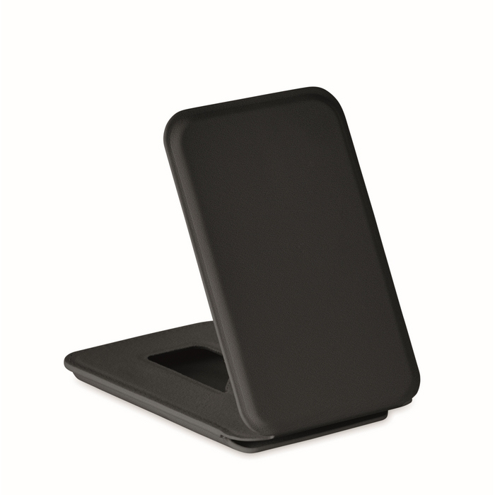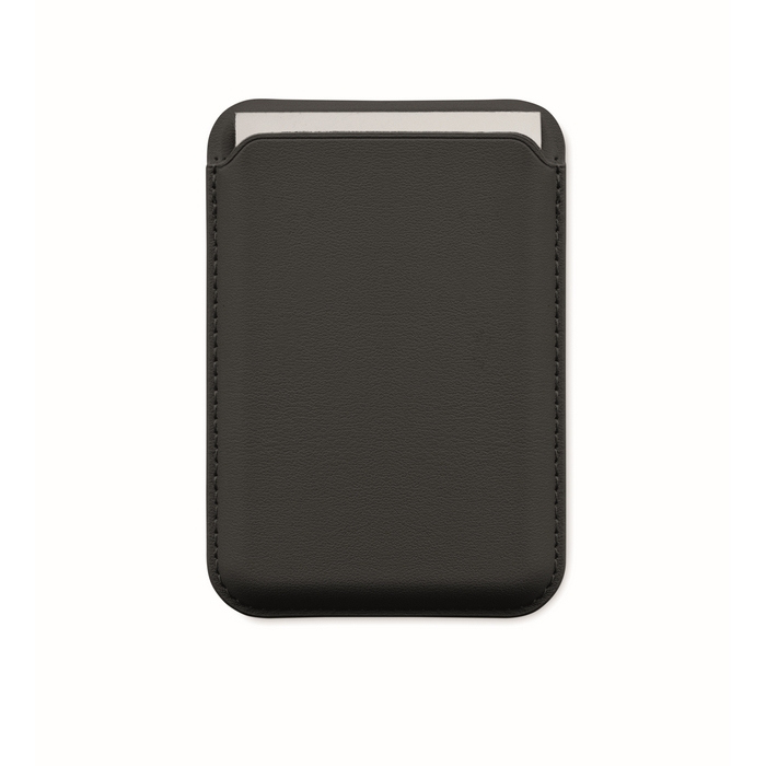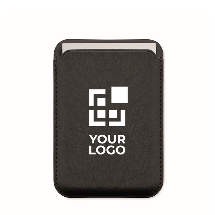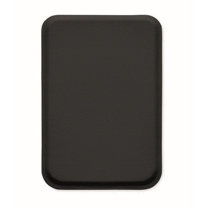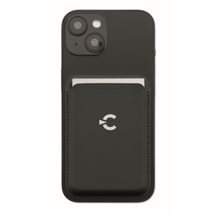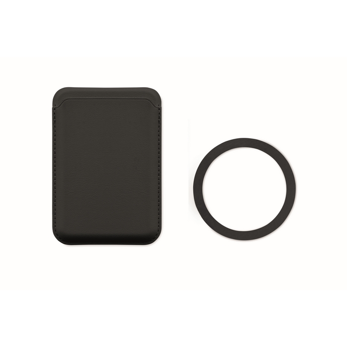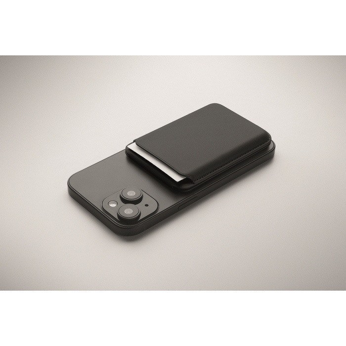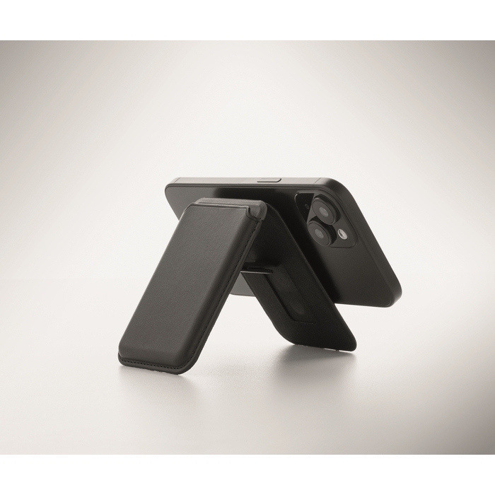 Tarjetero magnético de polipiel de PU pensado para llevar tarjetas de crédito de forma organizada. Tiene capacidad para hasta 3 tarjetas y se fija al móvil u otras superficies compatibles mediante su base magnética. Incorpora función de soporte para apoyar el teléfono y facilitar videollamadas o la visualización de contenidos. Incluye una anilla metálica adicional que mejora el agarre y ayuda a manejar el dispositivo con una sola mano. Útil para acciones de bienvenida, ferias o packs corporativos.