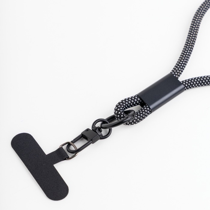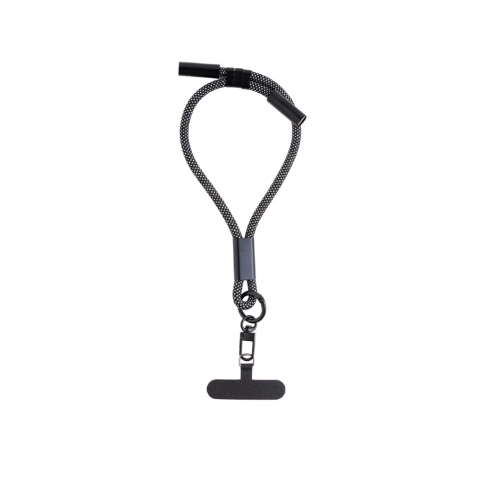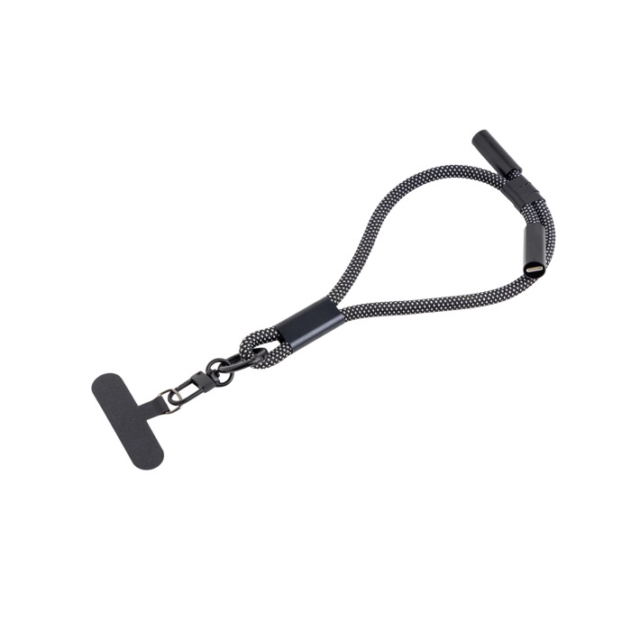 Lanyard de muñeca fabricado en PVC, nailon y detalles metálicos, ofrece una combinación de resistencia y funcionalidad. Con tecnología de carga rápida a través de dos puertos USB-C (Universal Serial Bus Tipo C), este lanyard de 42 cm está diseñado para mantener el móvil seguro y accesible. Su tejido robusto en blanco y negro incluye tres presillas ajustables, permitiendo cargar dispositivos y transferir datos de manera eficiente. Ideal para empresas que buscan soluciones prácticas y estilizadas para sus equipos móviles. Perfecto para eventos corporativos o como parte de un kit de bienvenida para empleados.