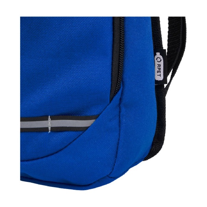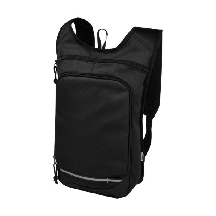 Mochila sostenible fabricada con tejido 100% reciclado, certificada por el Global Recycled Standard (GRS). Diseñada para resistir las inclemencias del tiempo, su material es repelente al agua, asegurando que el contenido se mantenga seco. Incluye un práctico bolsillo delantero con cremallera para acceso rápido y un compartimento principal compatible con bolsas de hidratación, ideal para actividades al aire libre. Las franjas reflectantes mejoran la visibilidad en condiciones de poca luz, mientras que la parte trasera de malla proporciona comodidad durante su uso prolongado. Perfecta para empresas que buscan productos sostenibles para actividades corporativas o como parte de su estrategia de marketing ecológico.