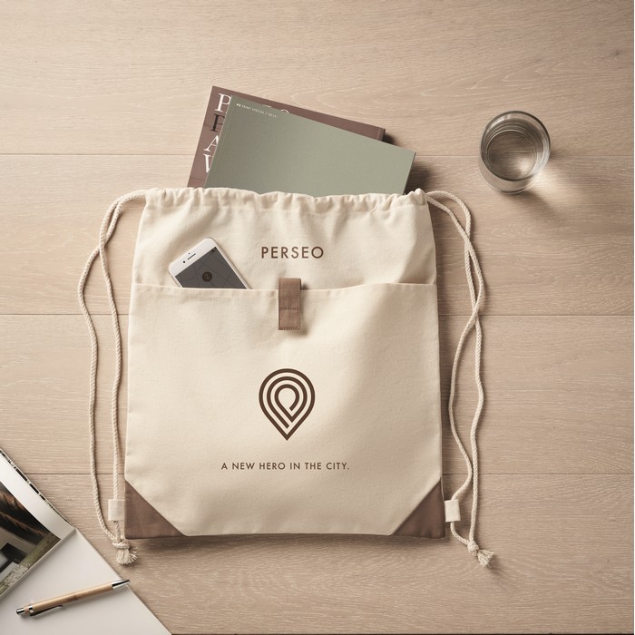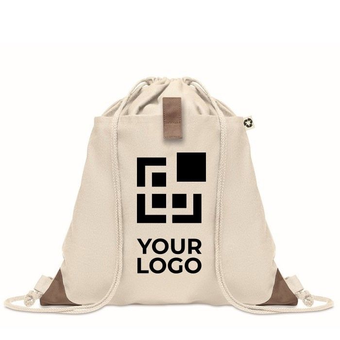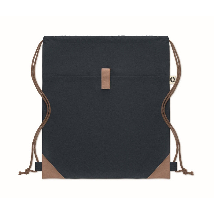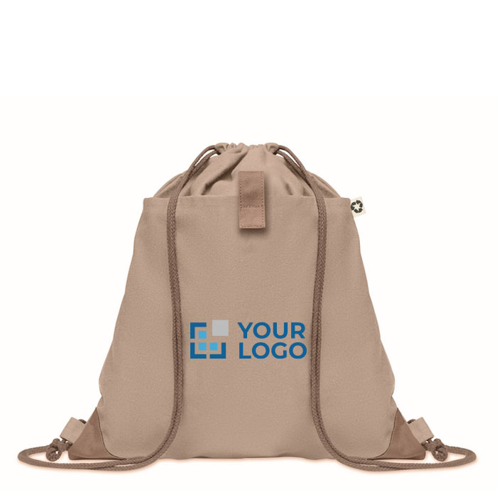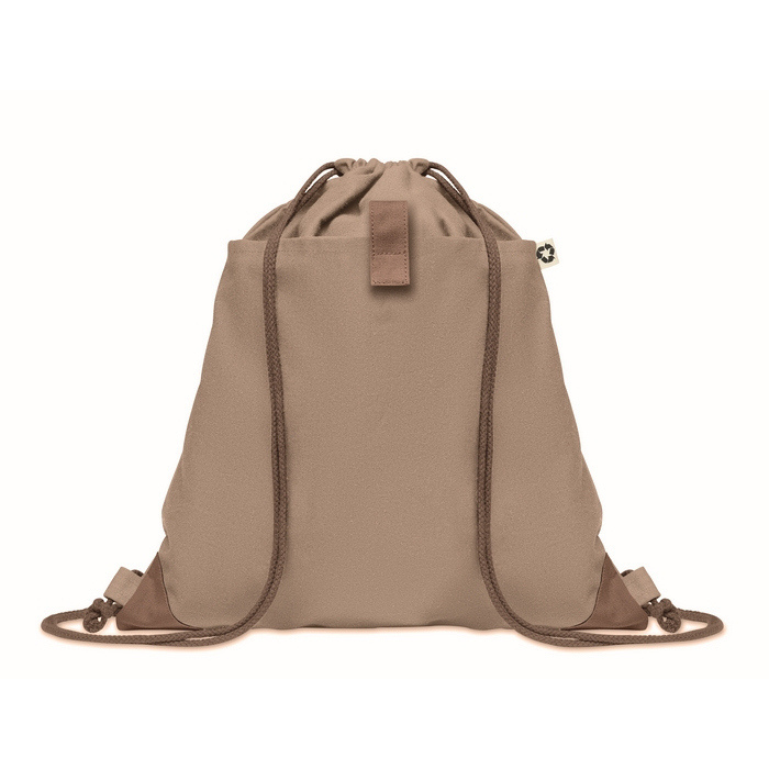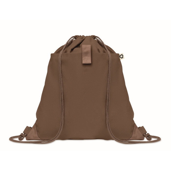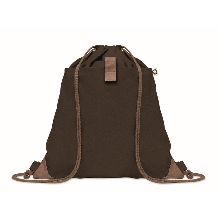 Promociona tu marca con estilo y sostenibilidad con esta bolsa de cuerdas tipo saco. Confeccionada en algodón reciclado de 220 g/m2, se presenta con un atractivo diseño bicolor, con la tela en la tonalidad que elijas de entre las opciones disponibles, y detalles como cuerdas y esquinas en marrón. Puede personalizarse en ambas caras y ofrece una amplia área de marcaje para que añadas tu logotipo, incluso con impresiones a todo color. ¡Solicitalo con entrega rápida y sorprende a trabajadores y clientes más pronto que tarde!
