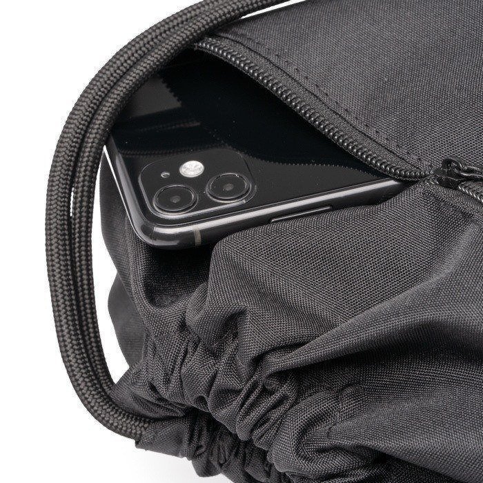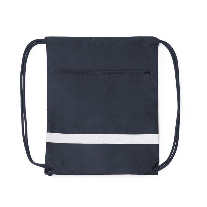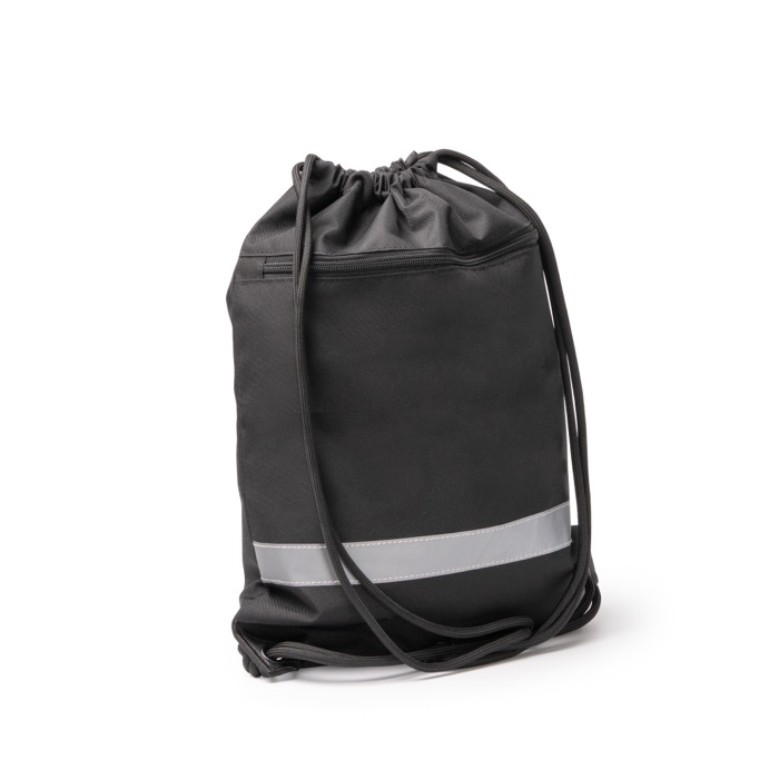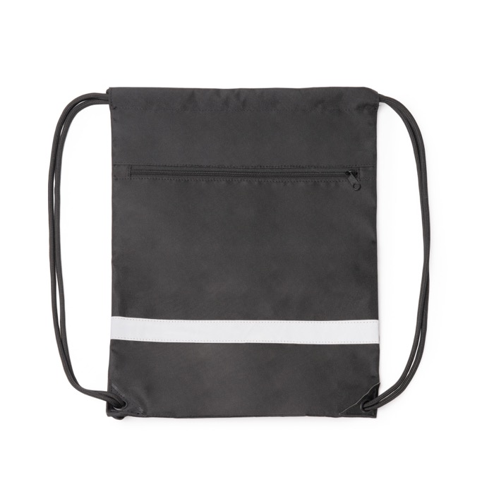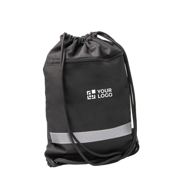 Mochila de cuerdas con bolsillo de cremallera y cinta reflectante, pensada para que tu logo acompañe desplazamientos, ferias y acciones con visibilidad constante.