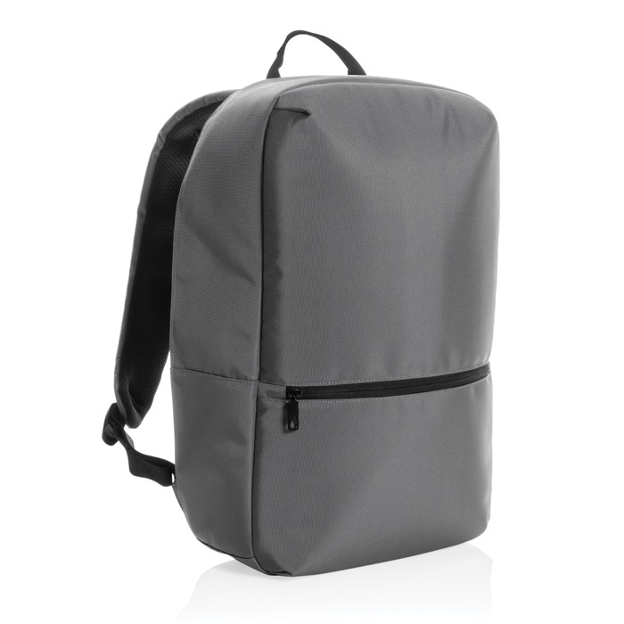 Mochila para ordenador portátil fabricada en poliéster 100% reciclado de 1200D, diseñada para portátiles de hasta 15,6 pulgadas. La parte posterior acolchada garantiza comodidad durante su uso prolongado. Incluye dos bolsillos con tecnología RFID (Identificación por Radiofrecuencia) para proteger la información de tus tarjetas. Con un marcador AWARE™ que certifica el uso genuino de materiales reciclados, esta mochila combina sostenibilidad y funcionalidad. Su capacidad de 13 litros la hace ideal para transportar documentos y dispositivos electrónicos. Suministrada en bolsa y a granel, es perfecta para empresas que buscan una opción corporativa práctica y responsable con el medio ambiente.
