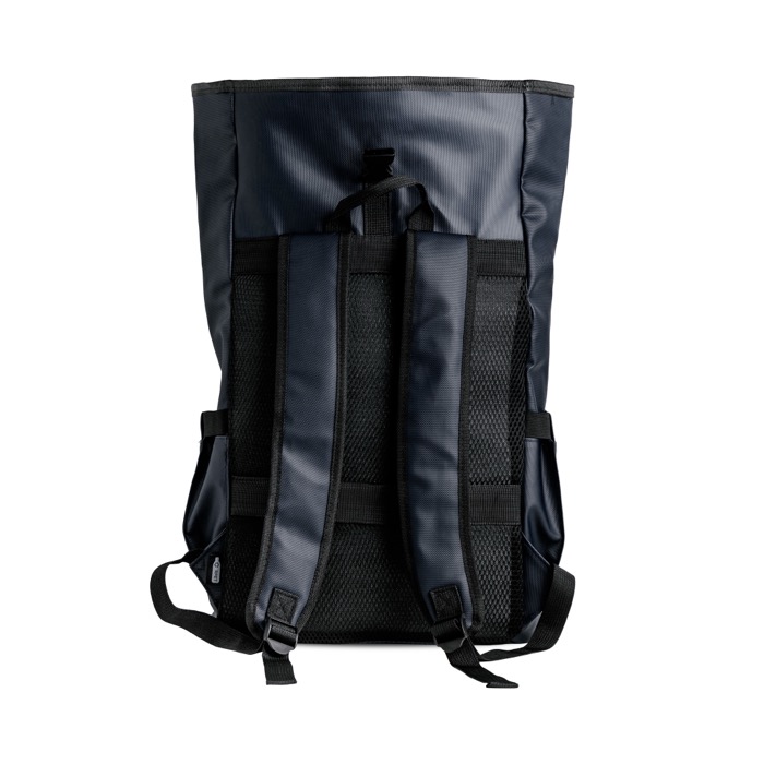 Mochila de plástico reciclado con recubrimiento de piel sintética, pensada para un uso diario exigente y mayor resistencia a salpicaduras. Incorpora compartimento principal con cierre y un bolsillo acolchado para portátil de hasta 15,6'', además de bolsillo frontal y bolsillos laterales para organizar accesorios, botella o documentos. Las correas ajustables y acolchadas ayudan a repartir el peso en desplazamientos. Una opción práctica para uniformidad corporativa, eventos y acciones de visibilidad con tu logo.