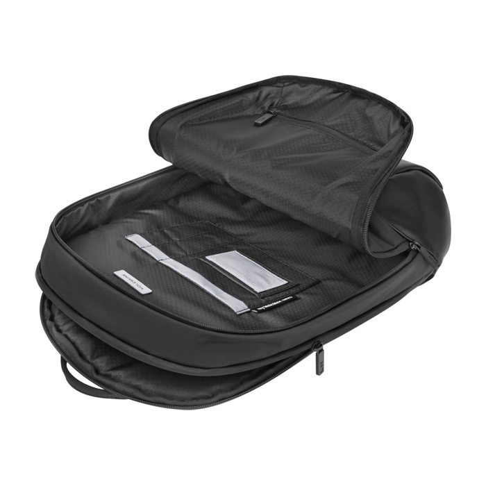 Mochila de tejido resistente con diseño actual para rutinas de trabajo móviles. Incorpora dos compartimentos principales, con sección compatible con portátil de hasta 15'' para transportar el equipo con orden. La parte trasera de malla transpirable ayuda a mejorar la ventilación, y las correas ajustables facilitan un ajuste cómodo en trayectos diarios. Añade bolsillo frontal con cremallera y varios compartimentos interiores con organizador, portabolígrafos y tarjetero. Útil para acciones de RRHH, eventos profesionales o bienvenida corporativa con marca.