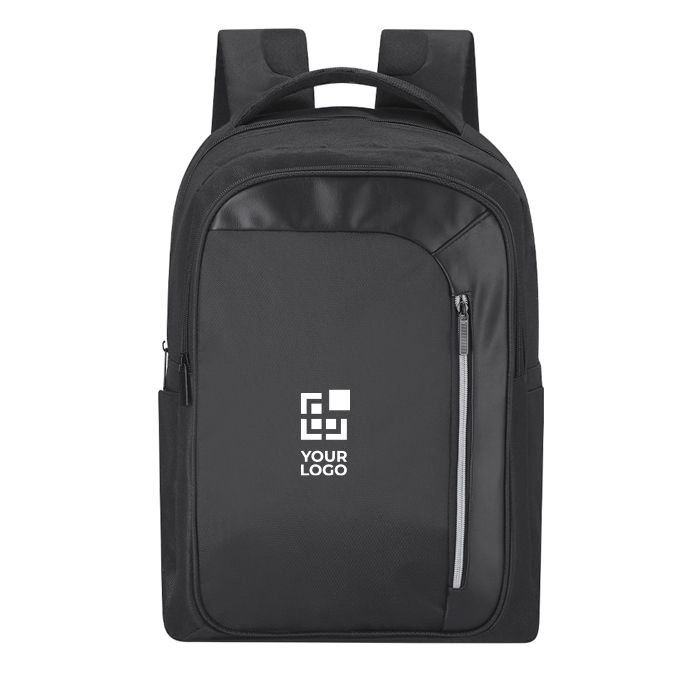 Mochila de poliéster 600D con tres compartimentos y protección RFID (identificación por radiofrecuencia) para bloquear lecturas no autorizadas de tarjetas. El compartimento principal con cremallera integra un bolsillo acolchado para portátil de hasta 15" y otro para tablet, facilitando el orden diario. Incluye bolsillo frontal y un segundo compartimento con organizadores de varios tamaños para accesorios. Suma dos bolsillos laterales, correas acolchadas ajustables, asa superior y cinta trasera para trolley. Recomendada para acciones de marca en ferias, viajes corporativos y uso en oficina.