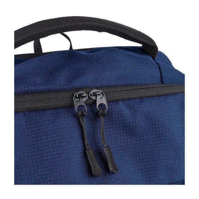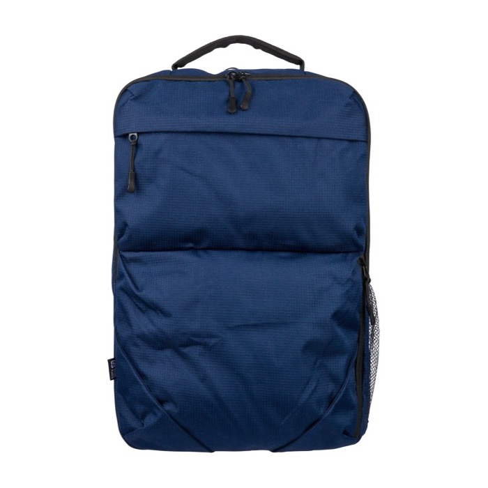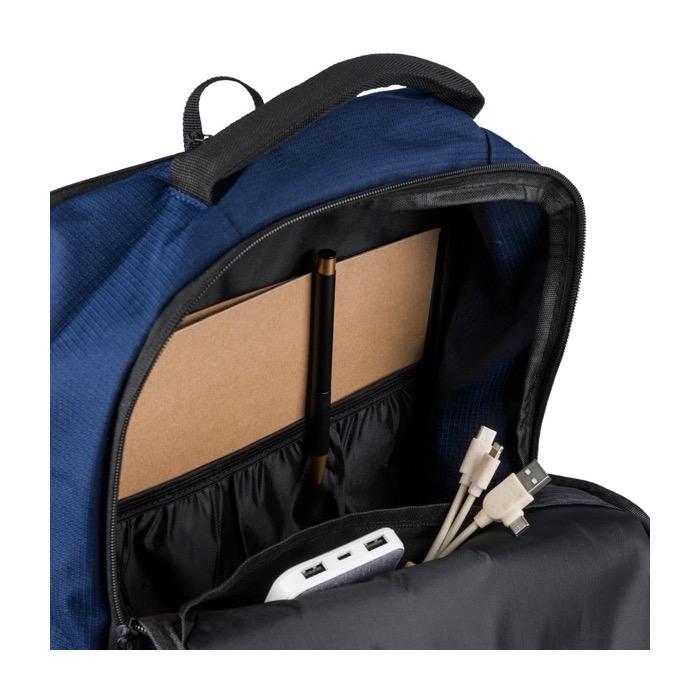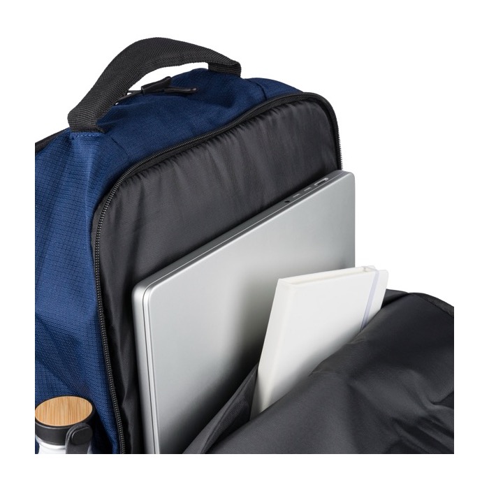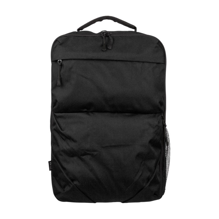 Mochila de poliéster de plástico reciclado con acabado texturizado, pensada para el ritmo diario de oficina y eventos. Ofrece 20000ml de capacidad repartidos en dos compartimentos grandes con cremallera, uno de ellos acolchado para portátil de hasta 15 pulgadas. Incorpora dos bolsillos frontales con cremallera, bolsillo lateral de malla y asa superior para un acceso rápido. El confort lo aportan los tirantes regulables ventilados, espalda acolchada y cinta para trolley. Útil como regalo corporativo para equipos, ferias o acciones de marca.