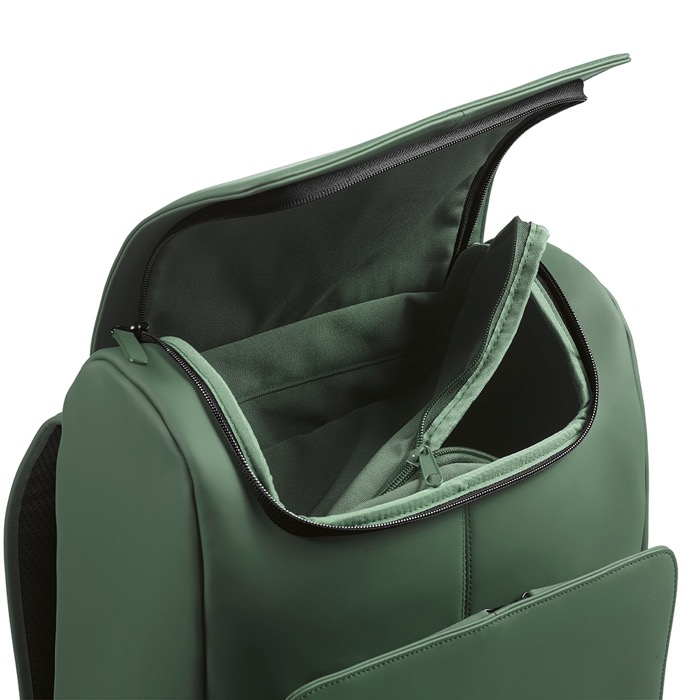 Mochila de 20 litros fabricada con PU (poliuretano) reciclado, ideal para empresas que valoran la sostenibilidad. Su diseño incluye un compartimento superior, uno frontal y una funda acolchada para portátil, todos accesibles de forma independiente, lo que facilita la organización. Los dos bolsillos laterales son perfectos para botellas o accesorios, mientras que las correas acolchadas garantizan comodidad durante el transporte. Con un embalaje individual en caja y bolsa, y un servicio Express disponible, es una opción práctica para cualquier negocio. Úsala como parte de un kit de bienvenida para empleados o como regalo corporativo en eventos.