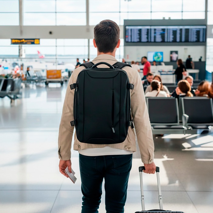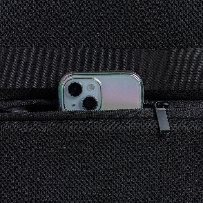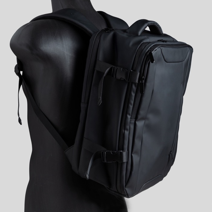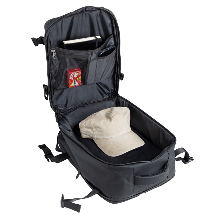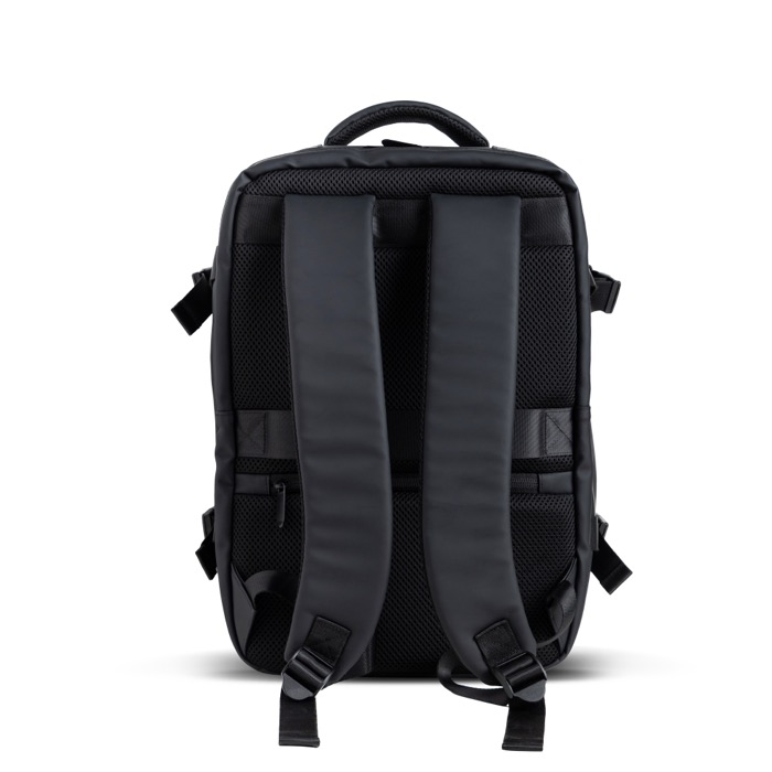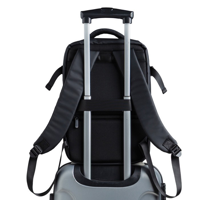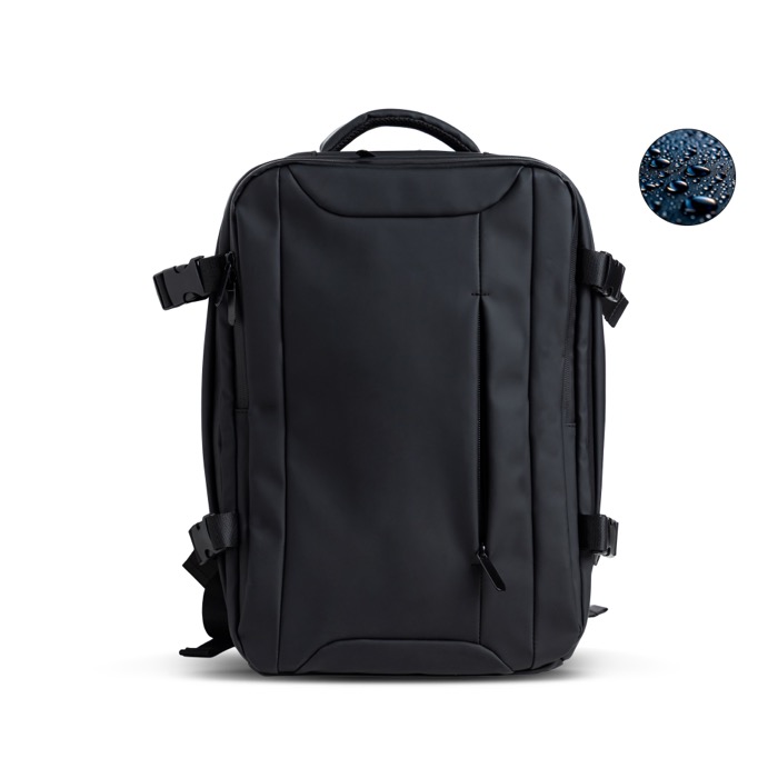 Mochila de piel sintética resistente con diseño extensible tipo under the seat para ganar capacidad cuando lo necesitas. Incorpora bolsillo antirrobo para proteger objetos de valor y compartimentos independientes que ayudan a organizar el día a día. Incluye un espacio impermeable para ropa o accesorios y un compartimento acolchado para portátil de hasta 15,6'', además de cierres resistentes al agua para mayor protección. Opción práctica para acciones de marca en viajes corporativos, eventos o uso diario en oficina.
