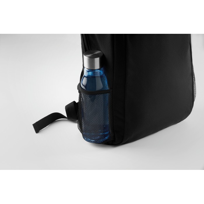 Completa mochila para portátil con logotipo fabricada en canvas y que incluye un bolsillo externo, compartimento para tablets, sujeción para trolleys y acolchado.