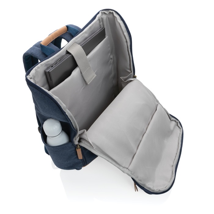 Mochila de lona reciclada, ideal para transportar ordenadores portátiles de hasta 15 pulgadas. Fabricada con un 60% de algodón reciclado y un 40% de poliéster reciclado, esta mochila combina sostenibilidad y funcionalidad. Su diseño incluye un profundo bolsillo frontal vertical con una elegante cremallera, facilitando el acceso a objetos esenciales. El forro está hecho de poliéster reciclado 150D, garantizando durabilidad y resistencia. Con una capacidad de 17,000 ml, ofrece amplio espacio para documentos y accesorios. Suministrada en bolsa y a granel, es un producto Bestseller. Perfecta para empresas que buscan integrar prácticas sostenibles en sus campañas de marketing y publicidad.