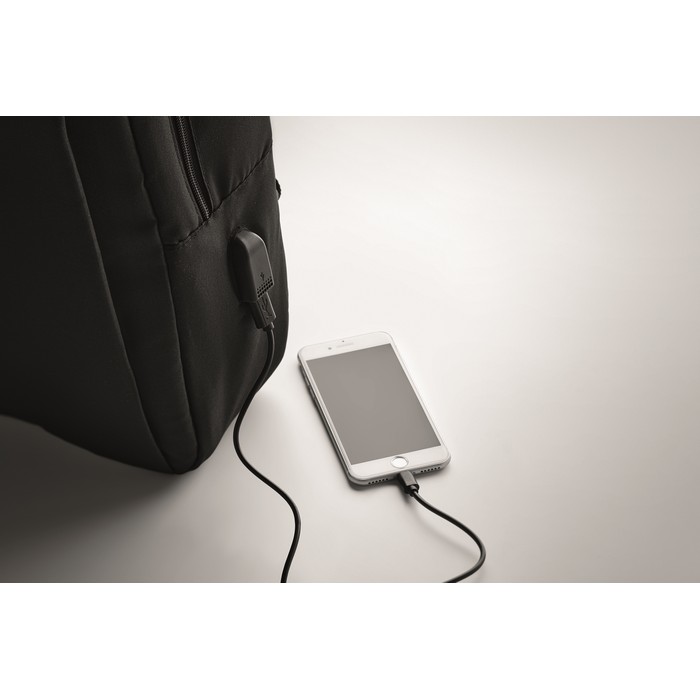 Mochila para portátil fabricada en poliéster RPET 300D, diseñada para ofrecer funcionalidad y sostenibilidad. Equipada con una correa de hombro acolchada, garantiza comodidad durante su uso diario. Su compartimento principal es ideal para portátiles de hasta 16 pulgadas, asegurando protección y fácil acceso. Incluye un conector USB tipo-A y un cable para conectar a tu powerbank (no incluido), facilitando la carga de dispositivos en movimiento. El uso de materiales reciclados (RPET) subraya su compromiso con el medio ambiente. Perfecta para empresas que buscan soluciones prácticas y sostenibles para sus equipos de trabajo o como parte de un kit corporativo.