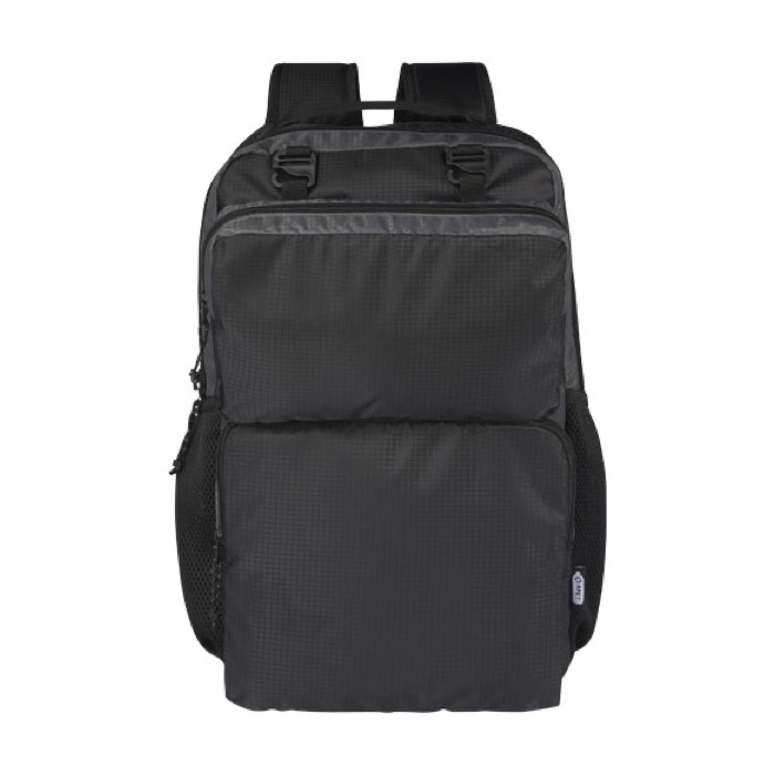 Mochila de 14 litros fabricada con tejido reciclado GRS (Global Recycled Standard) impermeable, ideal para empresas que buscan soluciones sostenibles. Incluye un forro GRS y una práctica riñonera extraíble, perfecta para adaptarse a diferentes necesidades. El bolsillo delantero cuenta con un panel de organización, facilitando el acceso a objetos esenciales, mientras que los dos bolsillos de malla son ideales para botellas. Las correas de hombro, acolchadas y ajustables, garantizan comodidad durante su uso. Su diseño con estampado de cuadrícula añade un toque moderno. Sin embalaje individual, ofrece un servicio express para entregas rápidas. Perfecta para transportar ordenadores de hasta 15 pulgadas, es una opción versátil para eventos corporativos o como parte de un kit de bienvenida para empleados.