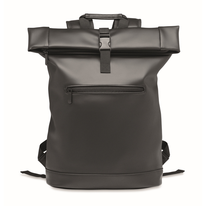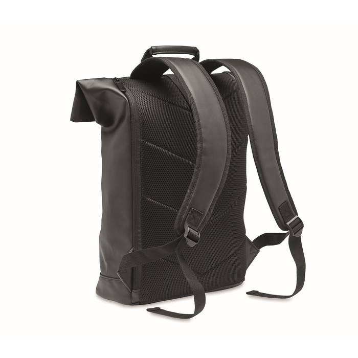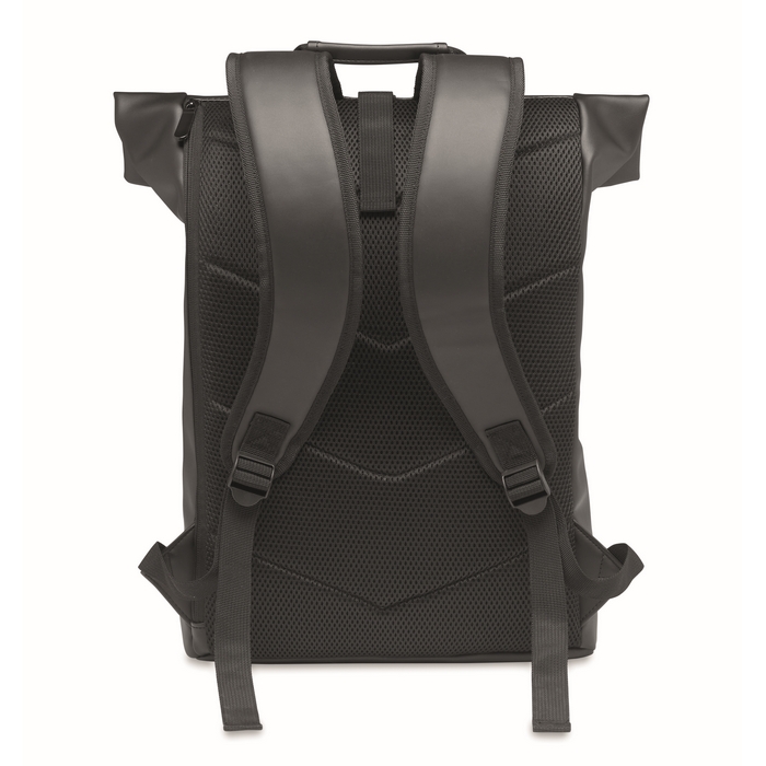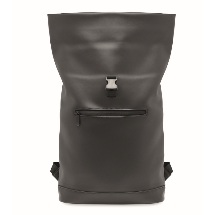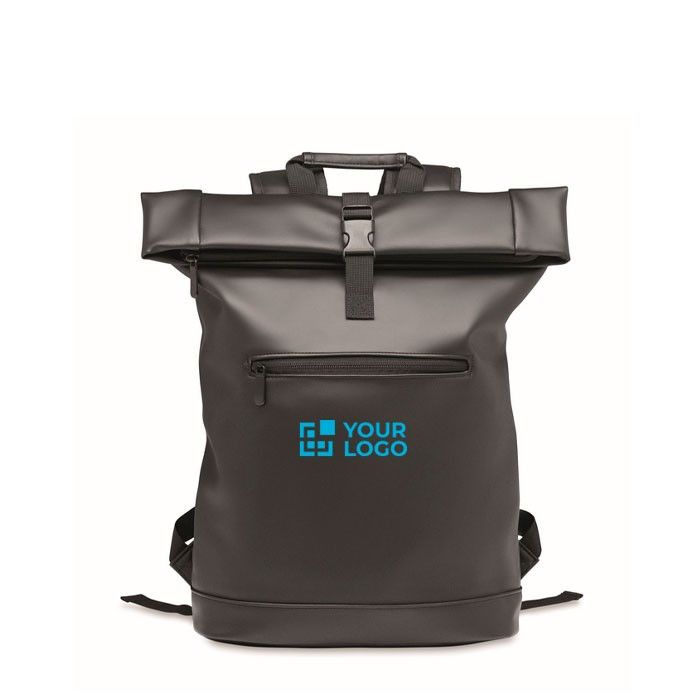 Mochila roll top fabricada en suave PU, diseñada para portátiles de hasta 15 pulgadas. Cuenta con un respaldo acolchado que proporciona comodidad durante el transporte y una base reforzada que asegura la durabilidad. El gran bolsillo frontal con cremallera ofrece un acceso rápido a objetos esenciales. El interior está forrado con RPET 210D, un material reciclado que añade un toque sostenible. Disponible en varios colores, esta mochila es ideal para empresas que buscan una solución práctica para el transporte de dispositivos electrónicos. Perfecta para personalizar con el logo de la empresa y utilizar en eventos corporativos o como regalo para empleados.