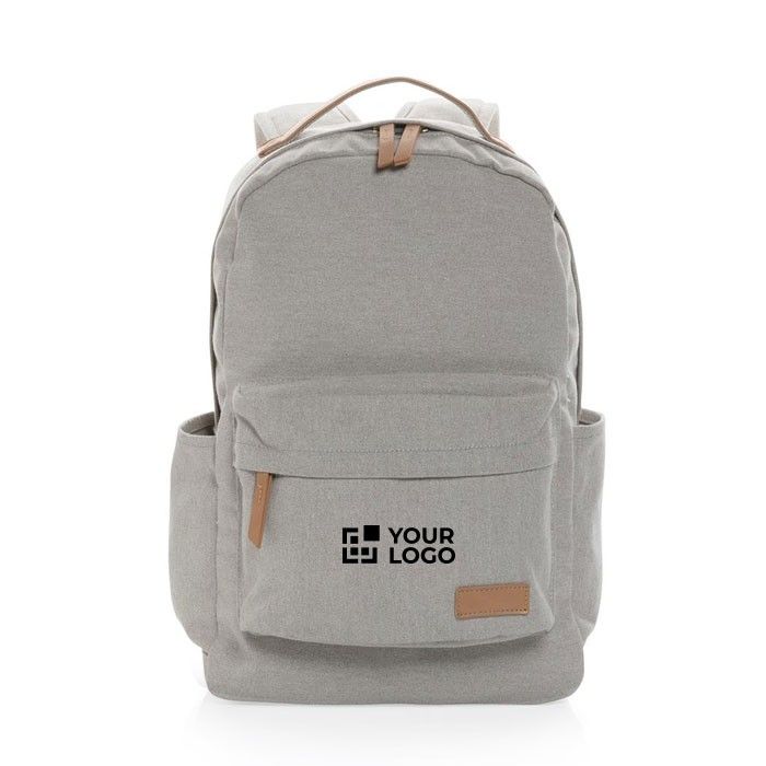 Mochila de lona reciclada de 16 oz, ideal para empresas que valoran la sostenibilidad. Fabricada con un 60% de algodón reciclado y un 40% de poliéster reciclado, esta mochila combina estilo vintage con funcionalidad moderna. Incluye un bolsillo acolchado para proteger ordenadores portátiles de hasta 14 pulgadas, asegurando que tus dispositivos estén seguros durante el transporte. Además, cuenta con amplios bolsillos delanteros y traseros para organizar otros elementos esenciales. El forro de poliéster reciclado 150D añade durabilidad. Con una capacidad de 16,000 ml, es perfecta para el día a día. Se suministra en bolsa y a granel, facilitando su distribución. Personalizable con el logo de la empresa, es una excelente opción para artículos corporativos o regalos promocionales.