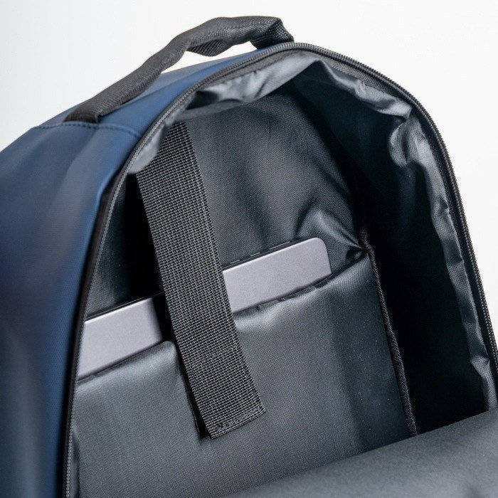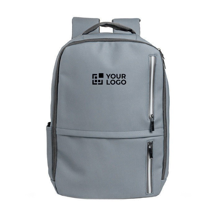 Mochila para portátil de 15,6 pulgadas fabricada en Soft PU, ideal para el uso diario o viajes de negocios. El compartimento principal incluye un divisor acolchado que protege el portátil, mientras que tres bolsillos frontales, dos con detalles reflectantes, mejoran la visibilidad y seguridad. Un bolsillo antirrobo ofrece tranquilidad adicional, y el bolsillo lateral es perfecto para botellas o accesorios. El asa para sujeción en trolleys facilita el transporte en aeropuertos o estaciones. Disponible en negro, azul marino y gris oscuro, esta mochila combina estilo y funcionalidad. Ideal para empresas que buscan soluciones prácticas para sus empleados en movimiento.