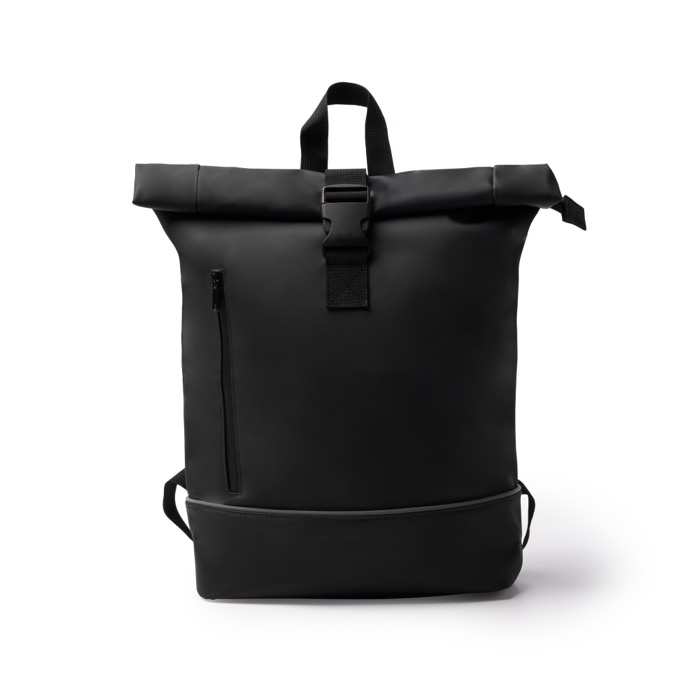 Mochila de piel sintética y plástico reciclado 210D con compartimento principal extensible, cierre de cremallera y hebilla para asegurar la carga. Incorpora un bolsillo acolchado para portátil de hasta 15” y un bolsillo interior con cremallera para accesorios. En el exterior, añade un bolsillo lateral con cremallera repelente al agua para objetos pequeños y una cinta reflectante inferior que mejora la visibilidad. La espalda y las asas acolchadas aportan comodidad, y la cinta reforzada para trolley facilita los desplazamientos. Recomendable para equipos comerciales, eventos y onboarding.