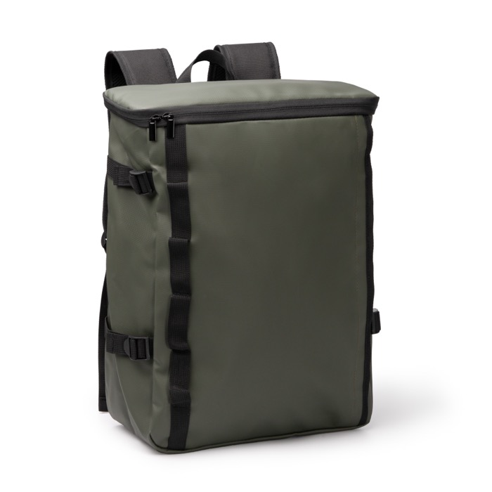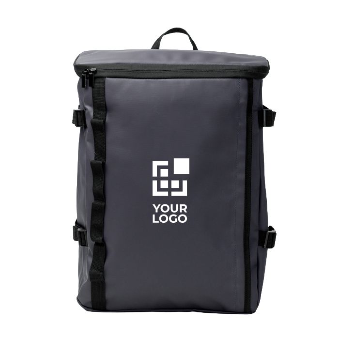 Mochila de piel sintética y poliéster 600D pensada para el día a día de empresa. Incluye un compartimento principal amplio con cierre de cremallera y parte superior forrada, además de un bolsillo interno con ajuste elástico para llevar un portátil de hasta 16”. Incorpora bolsillo frontal invisible para guardar objetos con discreción. Los seis puntos de anclaje laterales y las cintas de ajuste ayudan a adaptar el volumen según el contenido. Con cinta para trolley, espalda y asas acolchadas, resulta práctica para desplazamientos, eventos y regalos corporativos con logotipo.