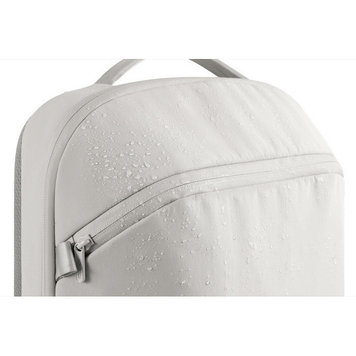 - Tejido repelente al agua y cremalleras con piel sintética