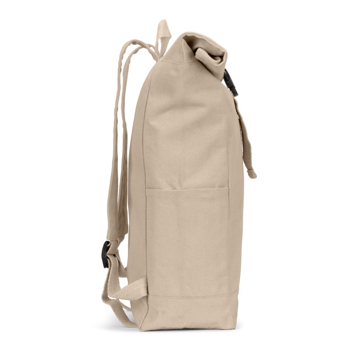 Mochila enrollable de algodón reciclado y poliéster reciclado de 380g/m², pensada para un uso diario cómodo y ordenado. Cuenta con 1 compartimento principal para llevar documentación, portátil o material de trabajo, y un cierre superior enrollable que ayuda a adaptar el volumen. Incorpora 1 bolsillo frontal con cremallera para objetos de acceso rápido y 2 bolsillos laterales para botella o accesorios. Opción práctica para packs de bienvenida, eventos internos o acciones de marca en movilidad.