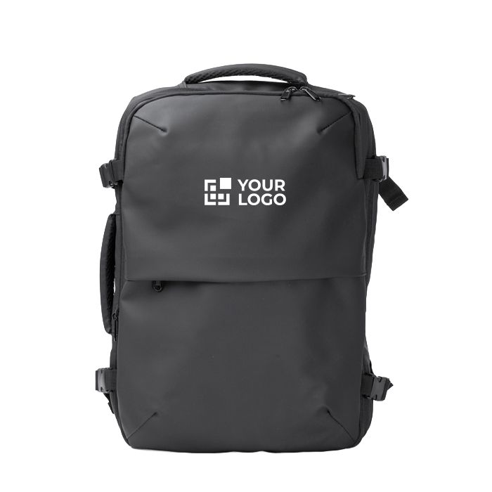 Mochila de piel sintética con formato extensible y sistema de compresión al vacío mediante bomba eléctrica de 30W, pensada para optimizar espacio en viajes y desplazamientos de trabajo. Incorpora compartimento principal con dos bolsillos interiores independientes con cremallera y tejido de rejilla para ordenar accesorios. En el exterior suma bolsillo superior con espacio para portátil de hasta 17" y un bolsillo invisible con cierre. Añade hebillas laterales de ajuste, cinta para trolley y espalda y asas acolchadas. Opción práctica para acciones de bienvenida, ferias o dotación interna.