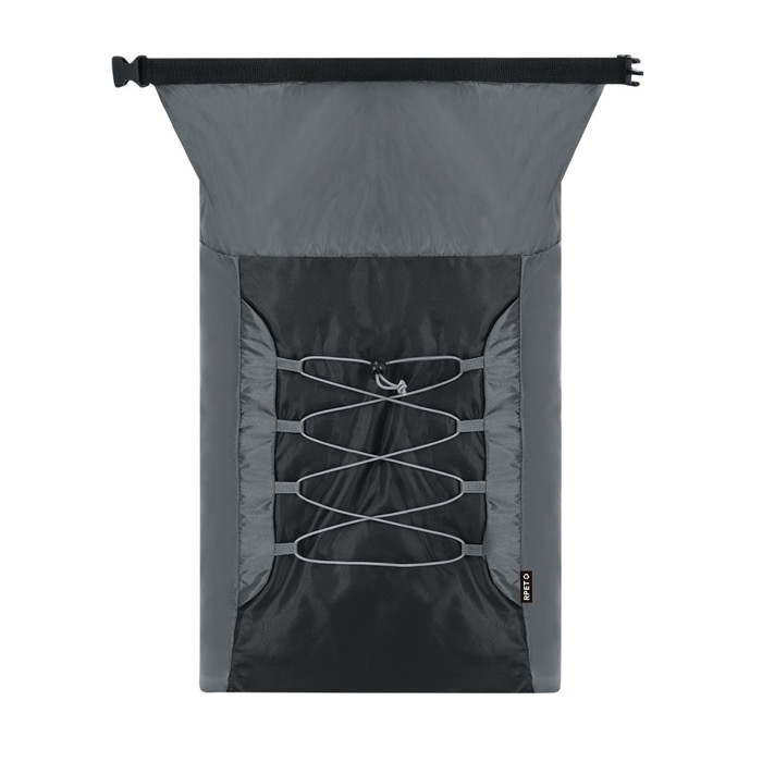 Mochila plegable de poliéster RPET con cordones elásticos al frente
