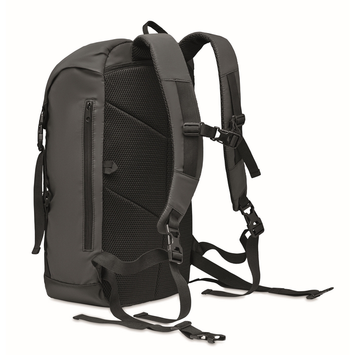 Mochila para exteriores fabricada en poliéster 190T con un recubrimiento de gránulos reflectantes. Incluye un bolsillo exterior lateral con cremallera y una espalda acolchada para mayor comodidad. El interior cuenta con un forro con cierre de cordón y un gran compartimento acolchado ideal para proteger un portátil. Las correas ajustables para los hombros, junto con la correa para el pecho y la cintura con cierre de hebilla, aseguran un ajuste perfecto. Además, su material repele el agua, lo que la hace ideal para condiciones climáticas adversas. Perfecta para empresas que buscan un artículo promocional práctico y de alta calidad para sus empleados o clientes.
