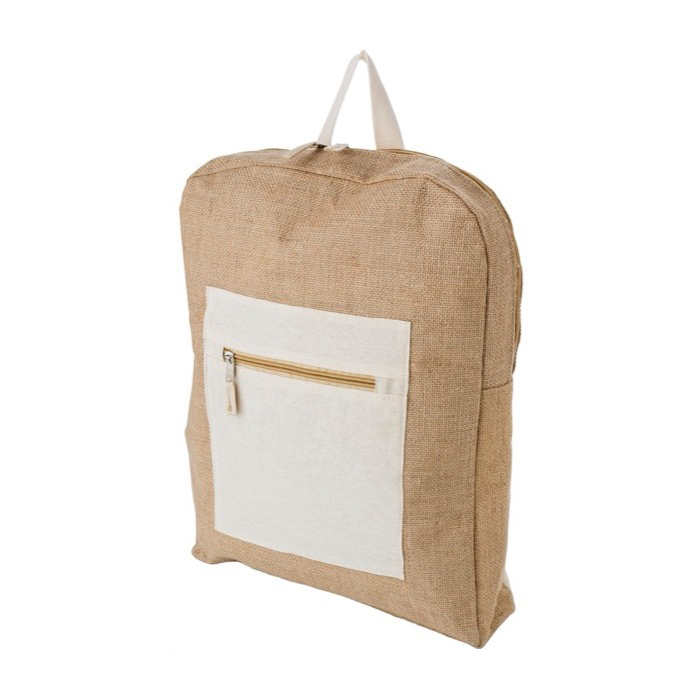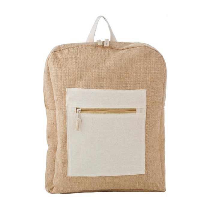 Mochila hecha de yute y algodón con bolsillo y cremallera frontal