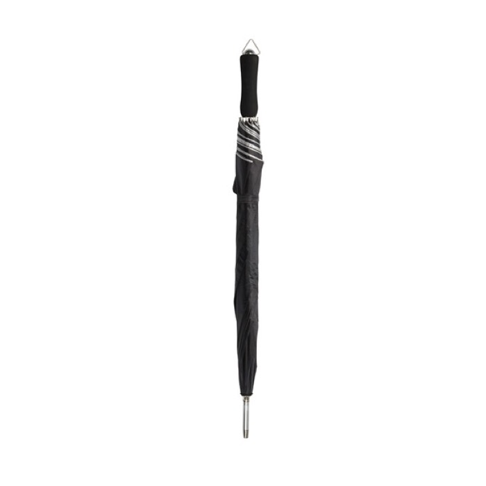 Paraguas de 27 pulgadas fabricado en poliéster 190T con un elegante recubrimiento interior plateado. El eje y las varillas están chapados en metal negro, lo que garantiza durabilidad y resistencia. Las puntas de plástico negro y el mango recto de EVA proporcionan un agarre cómodo y seguro. Con un diámetro de 120 cm, ofrece amplia cobertura. Su sistema de apertura automática facilita el uso, mientras que el cierre es manual. Ideal para empresas que buscan un artículo de merchandising distintivo y funcional. Perfecto para eventos corporativos o como regalo promocional. Además, cuenta con servicio Express para entregas rápidas.