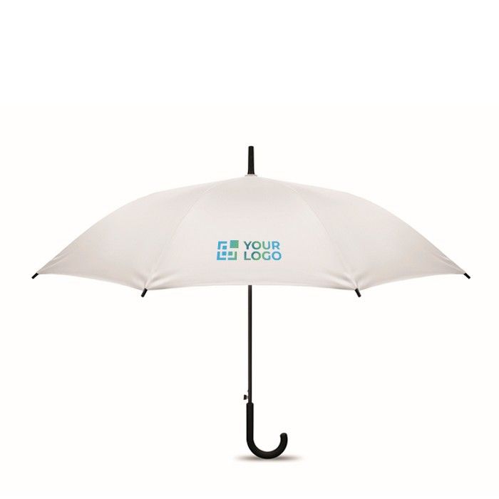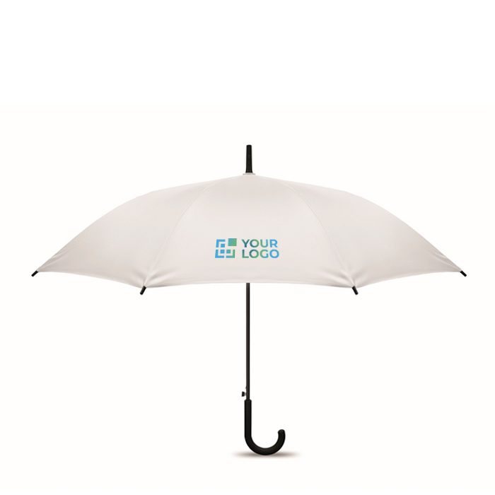 Paraguas antiviento recto de 23 pulgadas fabricado con una estructura de fibra de vidrio, ideal para resistir condiciones climáticas adversas. Los paneles están confeccionados con tejido pongee 190T, ofreciendo durabilidad y resistencia al agua. Las puntas y la parte superior son de plástico, asegurando ligereza y estabilidad. El mango curvo, hecho de plástico PP engomado, proporciona un agarre cómodo y seguro. Con un sistema de apertura automática y cierre manual, es práctico y fácil de usar. Perfecto para empresas que buscan un regalo corporativo funcional y memorable, ideal para eventos al aire libre o como parte de un kit de bienvenida.