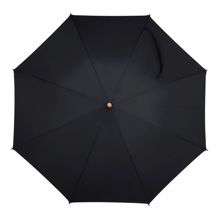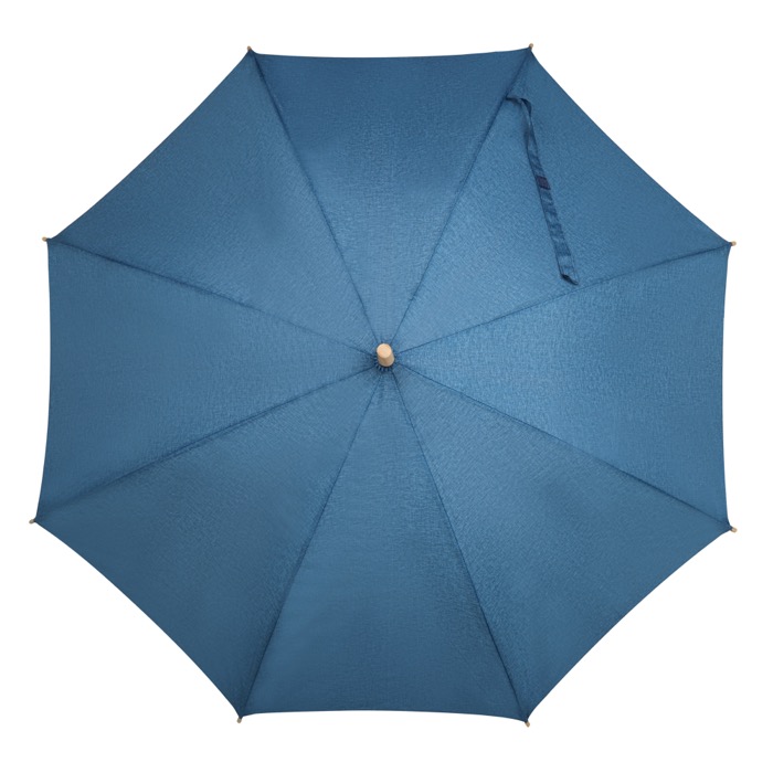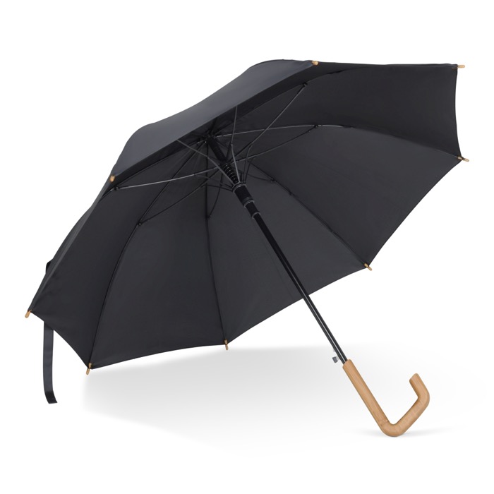 Paraguas de varilla fabricado en R-PET, con un mango de madera de diseño característico, ideal para empresas que valoran la sostenibilidad. Su marco de fibra de vidrio lo hace resistente a tormentas, asegurando durabilidad y protección en condiciones climáticas adversas. Las puntas de bambú y el eje de metal facilitan el reciclaje, mientras que el material de brezo le confiere un aspecto lujoso y profesional. Con un diámetro de 103 cm, ofrece amplia cobertura. El mango curvado proporciona un agarre cómodo, y su sistema de apertura automática y cierre manual garantiza facilidad de uso. Perfecto para eventos corporativos o como regalo de empresa, destacando el compromiso con el medio ambiente.