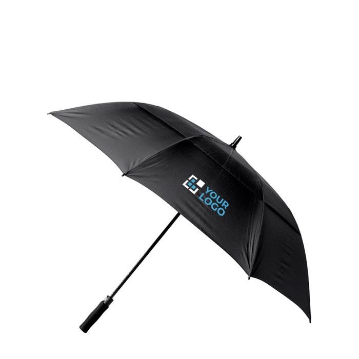 Paraguas de doble panel fabricado en RPET con mango recto de golf. Con un diámetro de 126 cm, ofrece una cobertura amplia para protegerte eficazmente de la lluvia. Su diseño de doble panel mejora la resistencia al viento, asegurando estabilidad en condiciones adversas. El cuerpo de fibra de vidrio aporta ligereza y durabilidad, mientras que el sistema de apertura automática y cierre manual facilita su uso. Disponible en negro y azul marino, combina elegancia y funcionalidad. Ideal para empresas que buscan reforzar su imagen corporativa con un toque de responsabilidad ecológica. Perfecto para eventos al aire libre o como regalo corporativo.