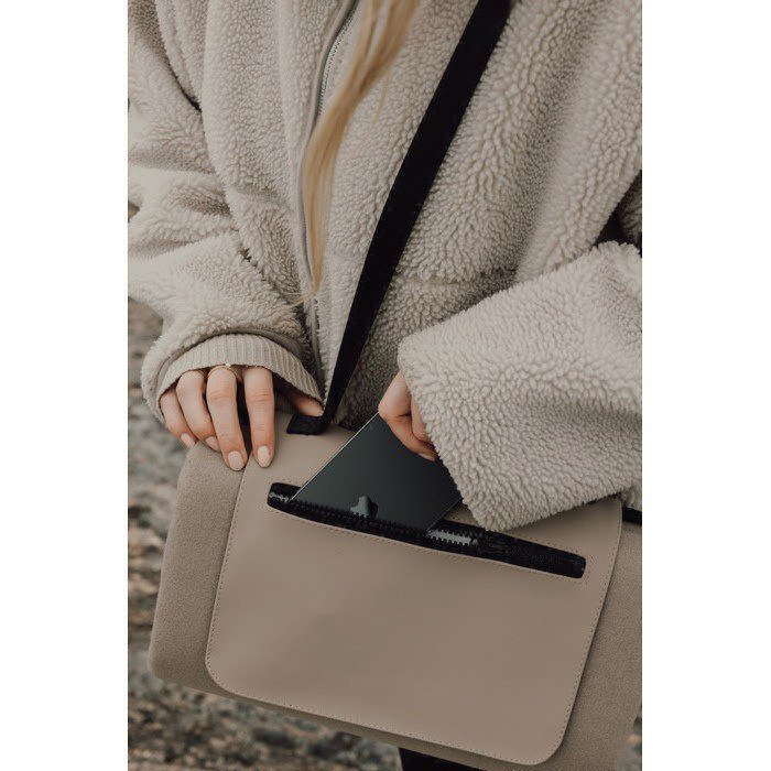 - Asa larga para transporte fácil y bolsillo frontal con cremallera