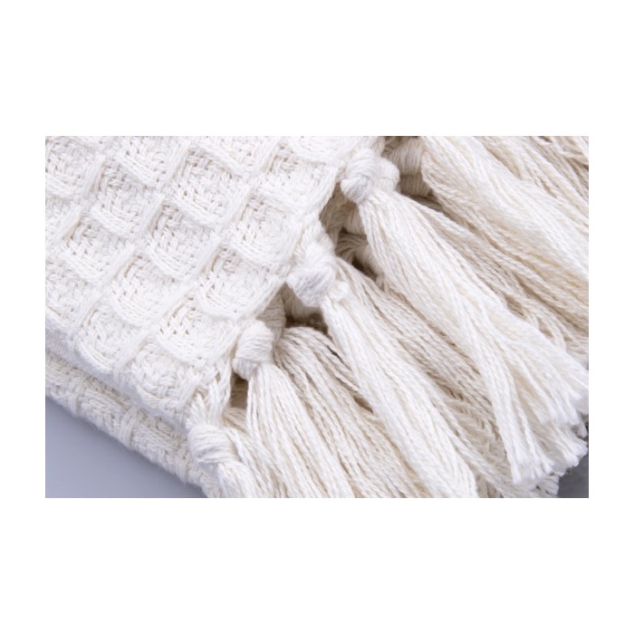 Manta de poliéster RPET con diseño de cuadros y flecos en el borde